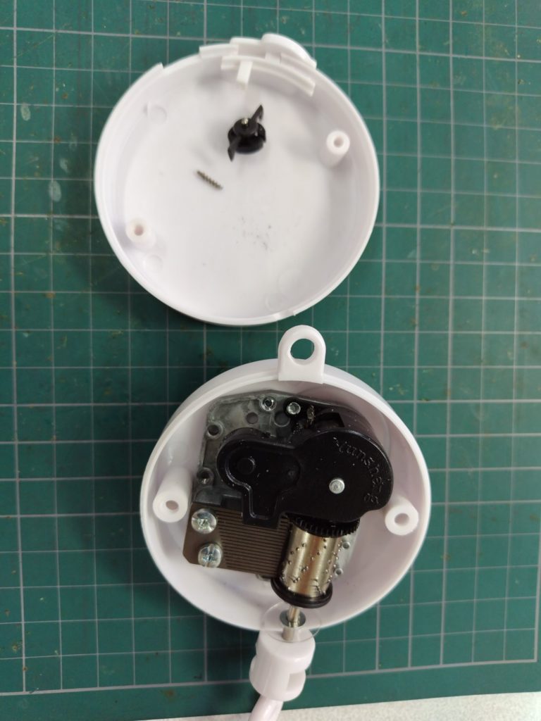 自分で新しい電池から電圧をかけるとモータ本体には電圧がかかり手で回すと回転しますが動きがなめらかではありません。しばらく正負を入れ替えながらモータを馴染ませていたら動きが安定化してきました。内部でグリスが固化している可能性が考えられましたが、モータを分解する前に回転しているモータの動きがギアに伝わっていないことがわかりました。