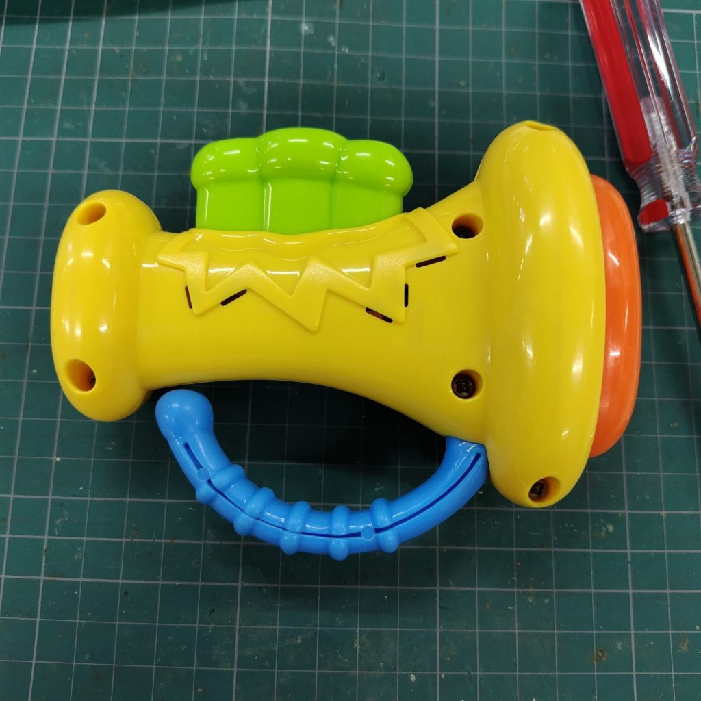 児童センターのおもちゃで上部の緑色の握るところで音が出るはずだが動きが悪いという主訴。