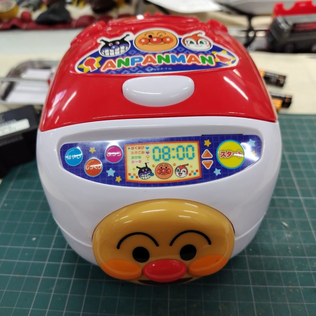 蓋を締めてしばらくすると「ごはんができたよ」とアンパンマンがしゃべるおもちゃですが、音が出ないという主訴。バッテリを入れてしばらく放置したままだったが久しぶりに使ってみたということです。