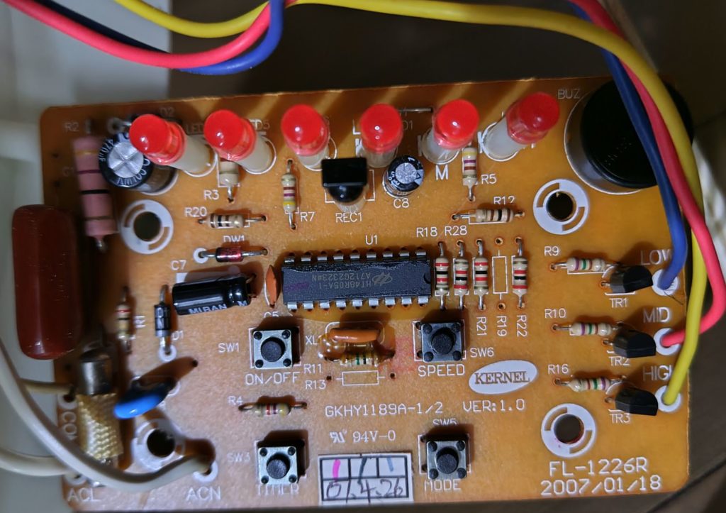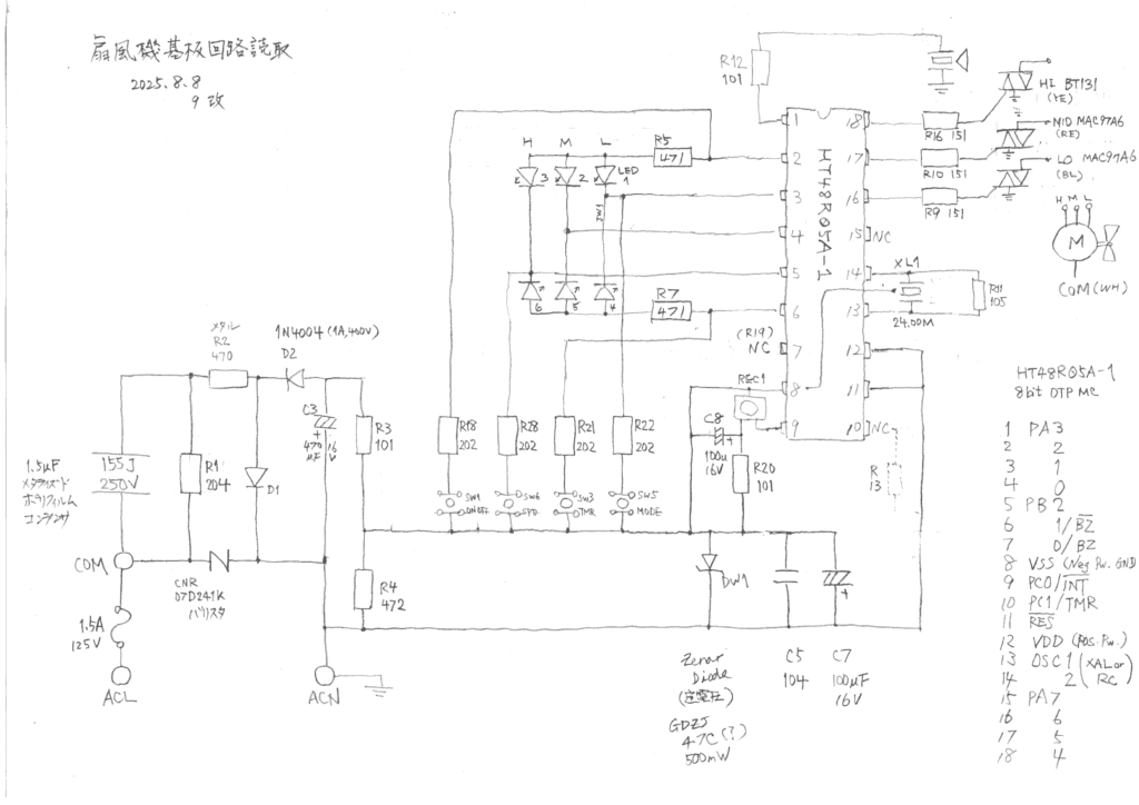 またトライアックという交流用の増幅器が3つも使われている理由がよくわかりませんでした。HIGH, MID, LOWという字が基板のシルクにあったのでモータの回転によって回路を変えているのかもしれませんが、トライアックはそもそも出力を自在に変えることができるデバイスのはずです。