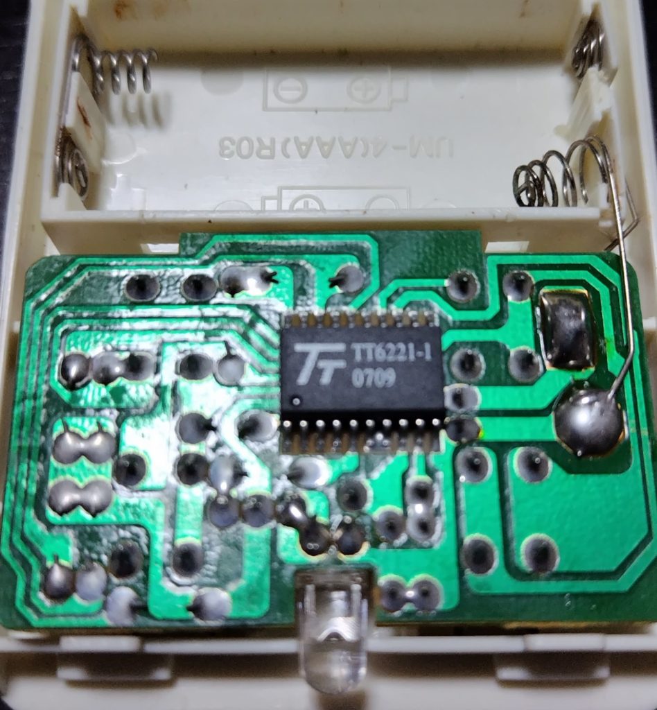 基板のパターン面です。こちらにはコントロールICとしてTT6221-1が使われていました。データシートを見ると赤外線リモコン用途に作られたICのようで、レゾネータは基準周波数を提供し38kHzの赤外線信号を作るためにあるという説明がありました。その他は単純なマトリクス回路。