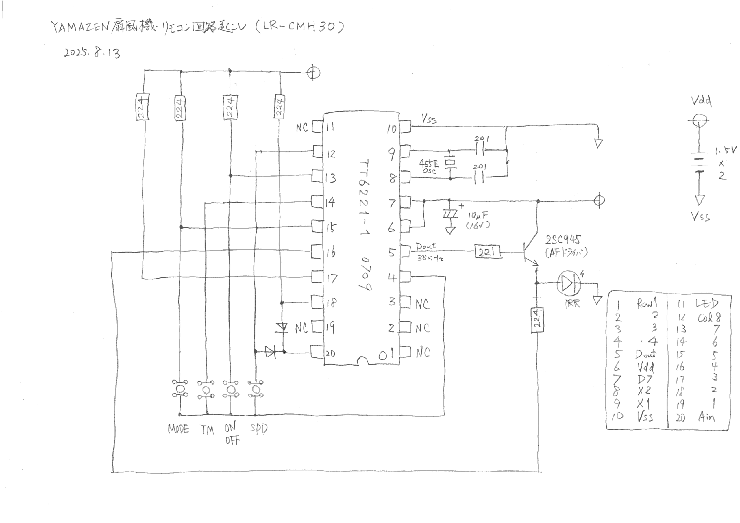 基板のパターン面です。こちらにはコントロールICとしてTT6221-1が使われていました。データシートを見ると赤外線リモコン用途に作られたICのようで、レゾネータは基準周波数を提供し38kHzの赤外線信号を作るためにあるという説明がありました。その他は単純なマトリクス回路。