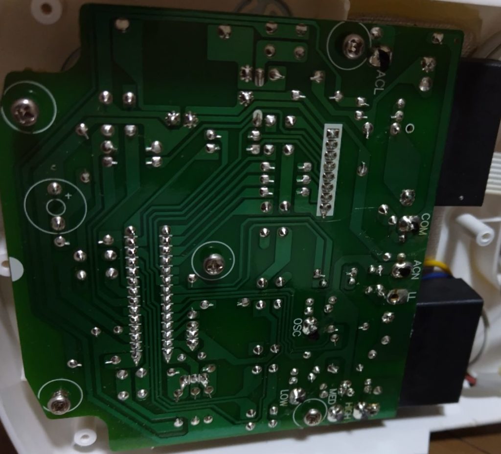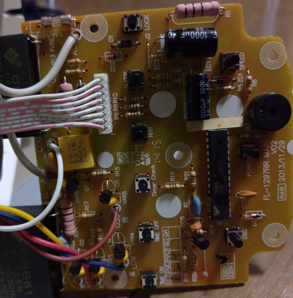 なんと、ICの電圧をテストしていたら突然ピッと音がして羽根が動き出しました。しかし本来のスイッチを押しても反応がない、・・しかしスイッチの開閉はテスタでは問題ない・・つまりICとスイッチの間ではOn/Off出来ているけれども、おそらくICからの出力信号がトライアックなどの駆動部品に届いていないのでは・・と考えました。