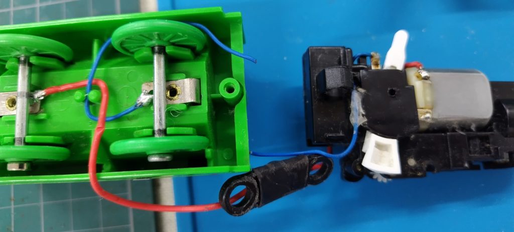 炭水車の方に電池が入り機関車のモータにコードで給電している構造ですが、接続部分がどうしても切れやすい構造です。外見から既に青線が切れていましたので修理依頼。