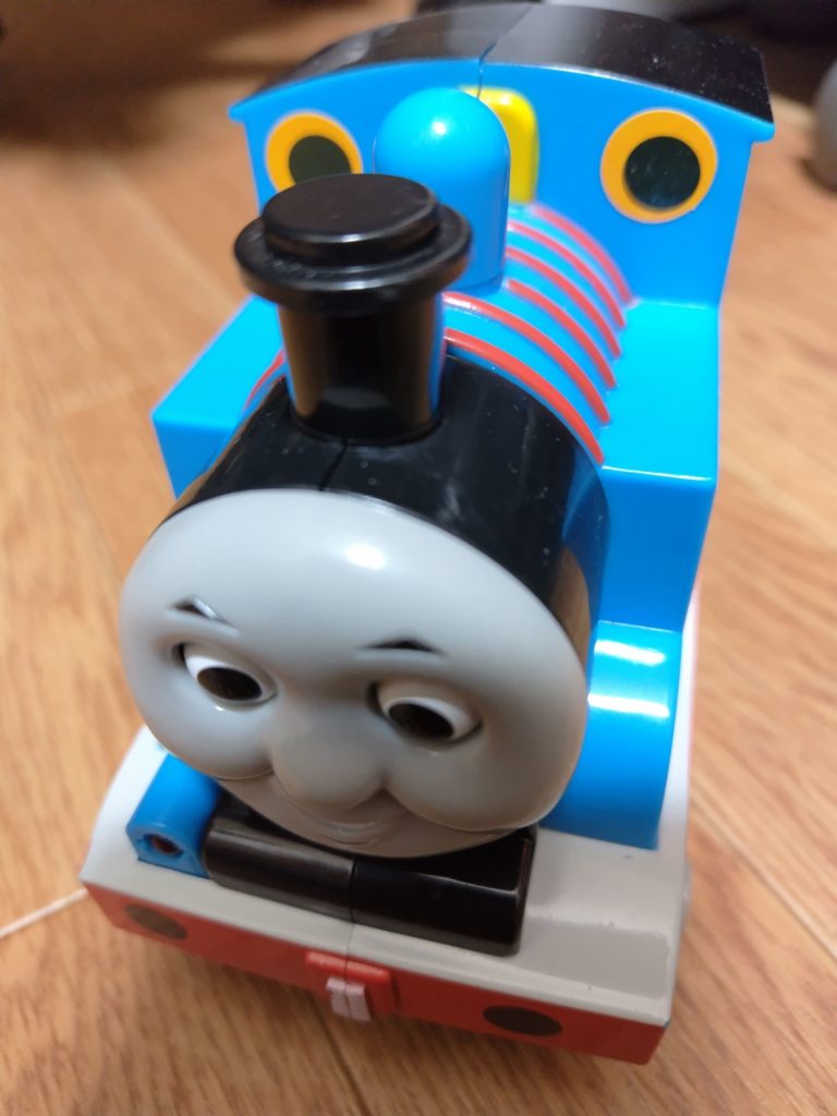 ところが後日、トーマスの分解修理をしようと電池を入れてみたら、なんと通常の動作をしました。目もキョロキョロ、ライトも光りますし、壁にぶつかったら方向を変える点も全く問題なく動作します。正常に動くものを分解するのはおもちゃドクターとしてはタブーですので、このトーマスはそのまま施設に寄贈する予定です。(2025年10月18日に吉祥寺東おもちゃ病院を通じておもちゃ図書館に寄贈しました。)。