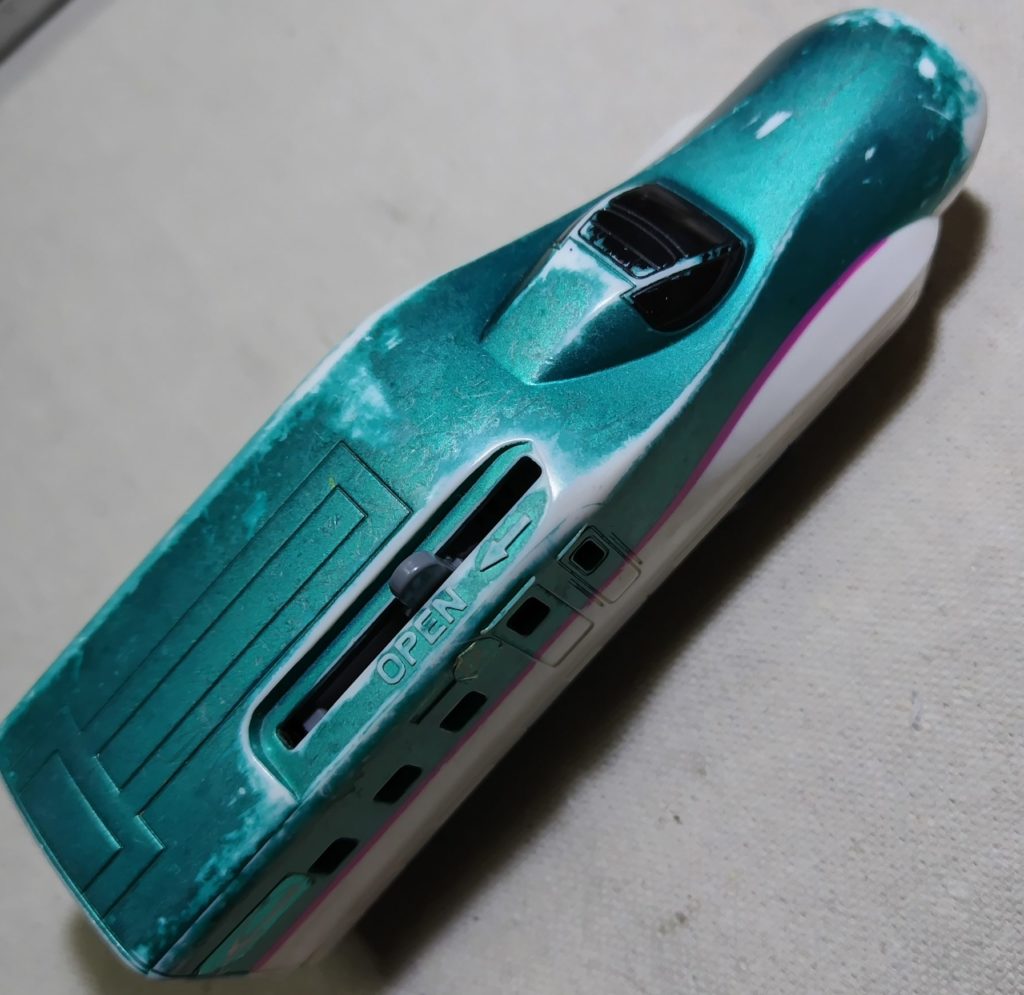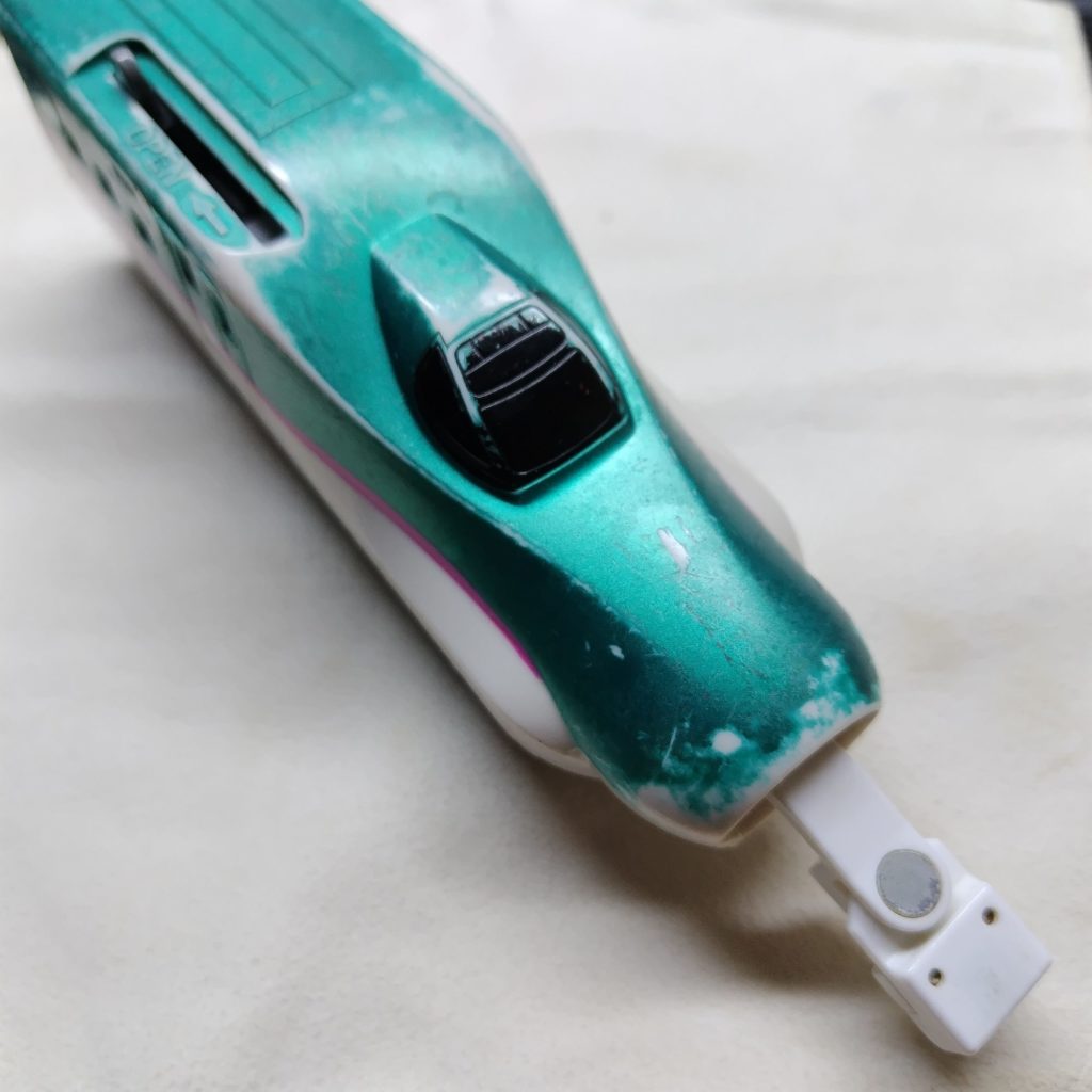 ジャンク屋さんで部品取りのために見つけたはやぶさです。塗装が擦り減っていてかなり使い込んでいる様子ですが、スイッチで鼻の部分から連結器が出入りする仕組みです。電池駆動ではありません。