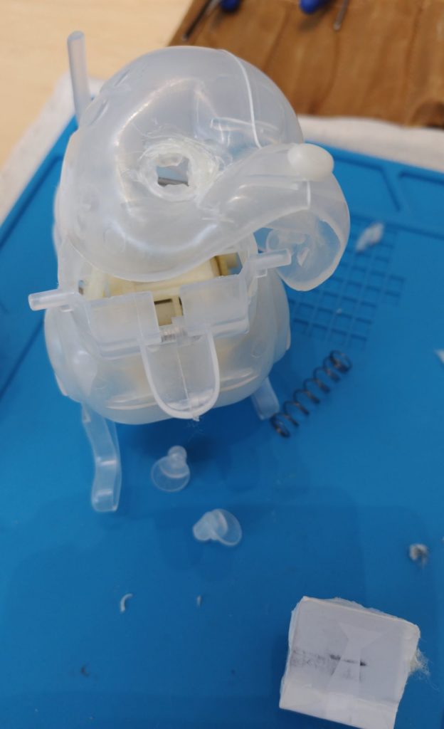 首のギアが壊れていることを一番心配しました。しかし外側を剥がして中を見ると構造物自体は壊れていたり折れていたりということはありませんでしたので一安心。首のところも弱い構造ではなく、先月ひばりで修理したものとは少し進歩しているようです。