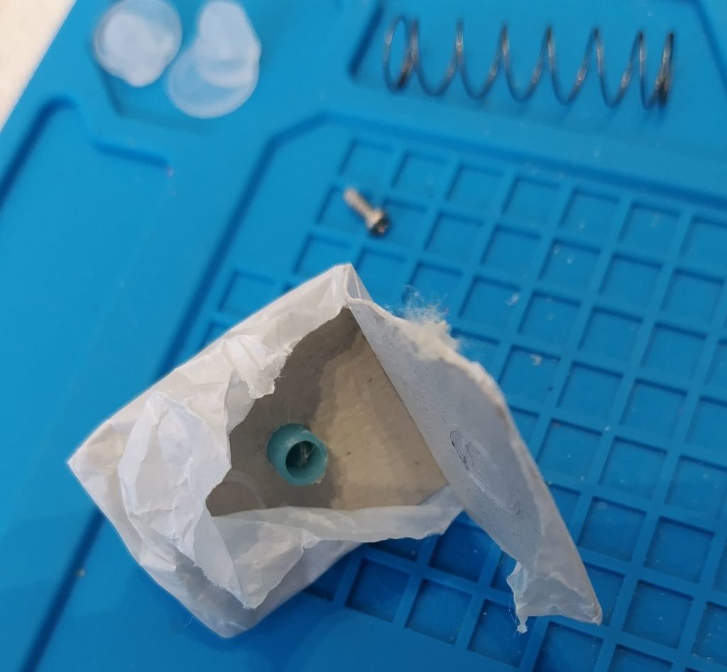しかし鳴き声を出す笛がものの見事に破れていました。穴が空いているというのはたまに聞きますが、ここまで派手に破れているのは不思議でした。しかし本体の中でバネが落ちていたので、このバネが弾いてしまって破れた可能性を推測しました。中のバネがくっついていたと思われる痕がフイゴの台紙に丸く見えますが、この程度の量の接着剤では剥がれてしまうでしょう。