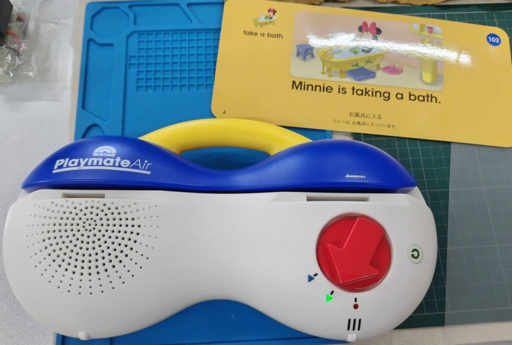 ディズニーのTalk Alongカードという英語教育システムです。英語学習といえばペン型のものがよく持ち込まれますが、このタイプは初めて。カードを右から差し込むと機械が英語を喋って、こちらはそれに答えると、カードが左にスライドして正解が聞こえるという代物です。