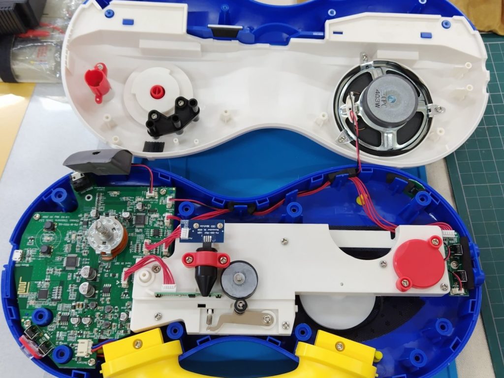 写真の白い大きな回転盤の脇に黒いゴムが薄っすらと見えますが、動かないローラー部分にモータから動力を伝えるゴムが切れていました。モータは動いているし、英語もきちんと聞こえるので、問題箇所はそこだけです。