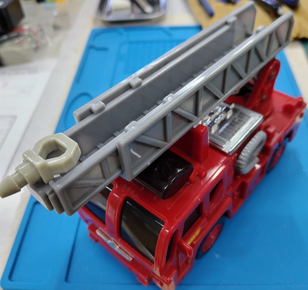 ・・・とあれこれして、電池を入れてスイッチを入れると、モータが動き、消防車のサイレンも鳴りました。思わず「おぉ〜」と唸ってしまいました。その他、赤色灯の導線も切れていたので新しい導線でLEDとのハンダ付けまでやっていただき、自分のやることがなくなってしまったので、最後の赤色灯の本体への接続は自分が持ち帰って対応することにしました。このとき既に閉院予定時刻を一時間も超過。児童センターでは別の予定が組まれていたらしく、会場へは子どもたちがたくさん入ってきて賑やかに。