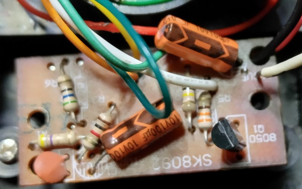 ボディを取り外すと既に断線が数本あり、どこにつながっていたのかわからない状態。さらに基板にもサビのような白い粉が吹いていて、コンデンサの電解液が吹き出てしまったのか。