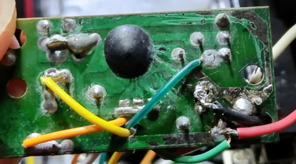 上の写真で右下の緑と赤の導線は電源部に直接つながっているところですが、ここが怪しいと見たのでしょう。いきなりハンダゴテをアテて外してしまいました。直ぐにわかったのは、ここのハンダは基板から浮いていたことと、導線が劣化して折れやすくなっていたこと。