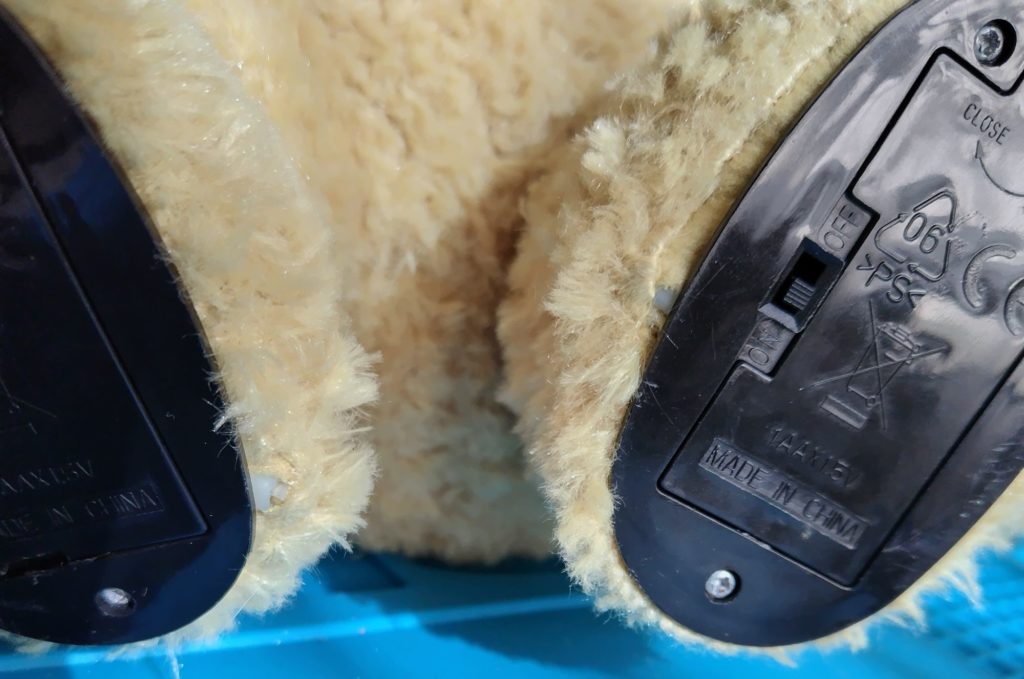さらに糸をほどいていきます。メインのおしゃべりする部分と脚を動かす部分が一体となったパーツがちょうどお腹の中にありました。綿を食い込ませないようにかガーゼで覆ってありました。