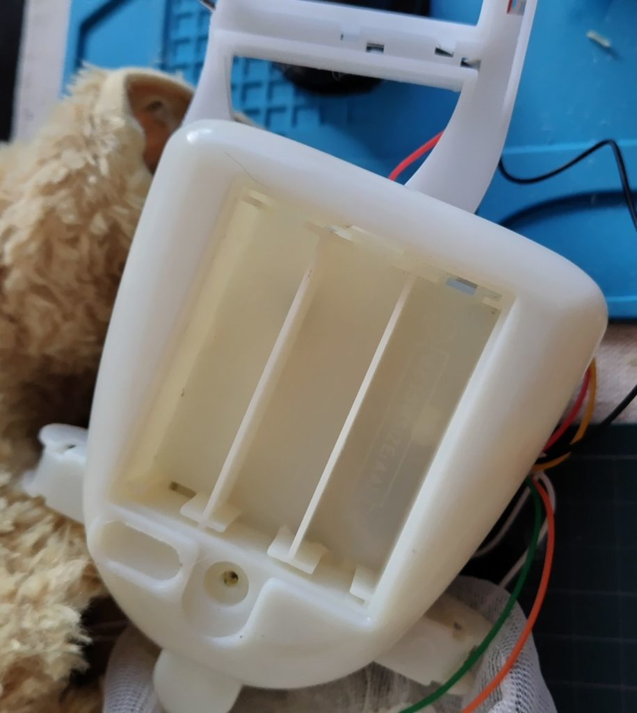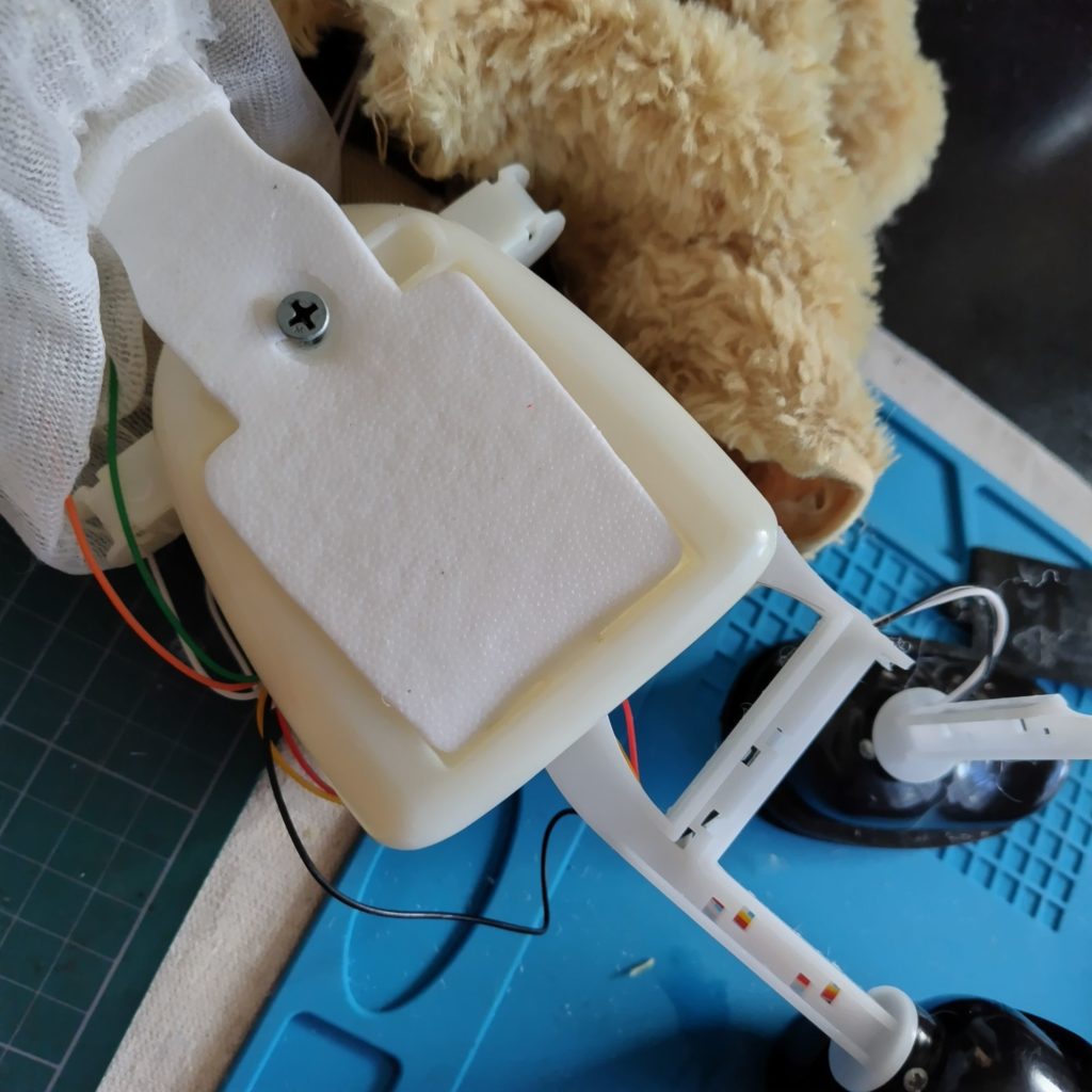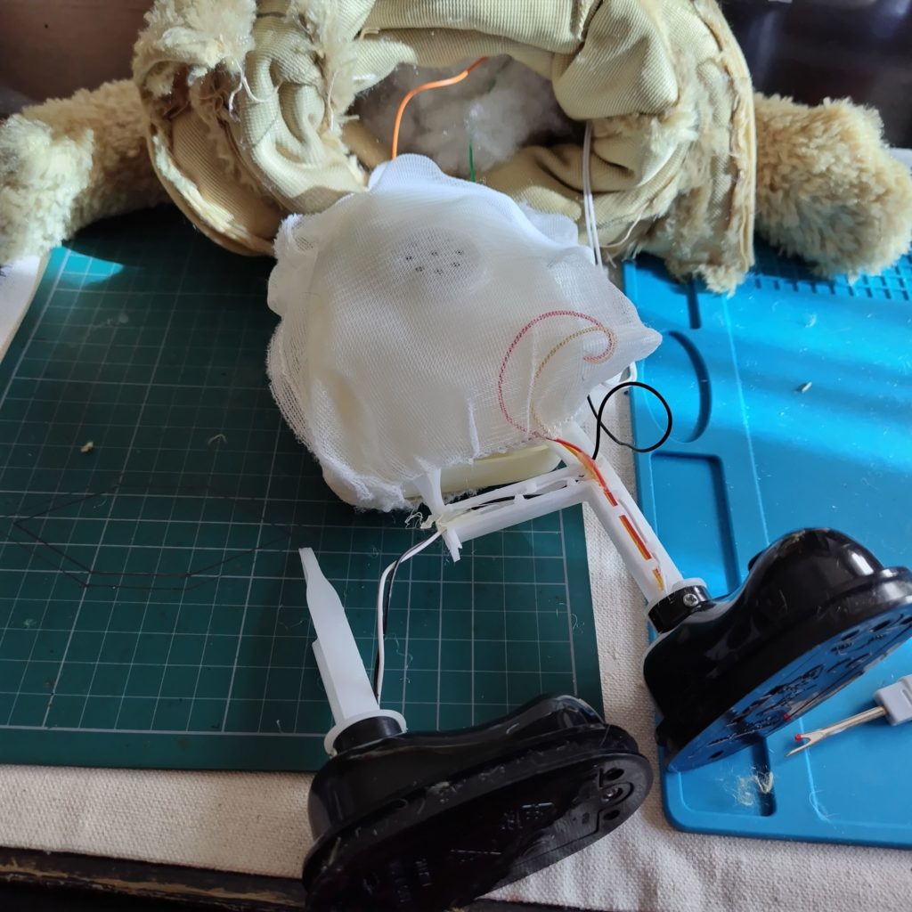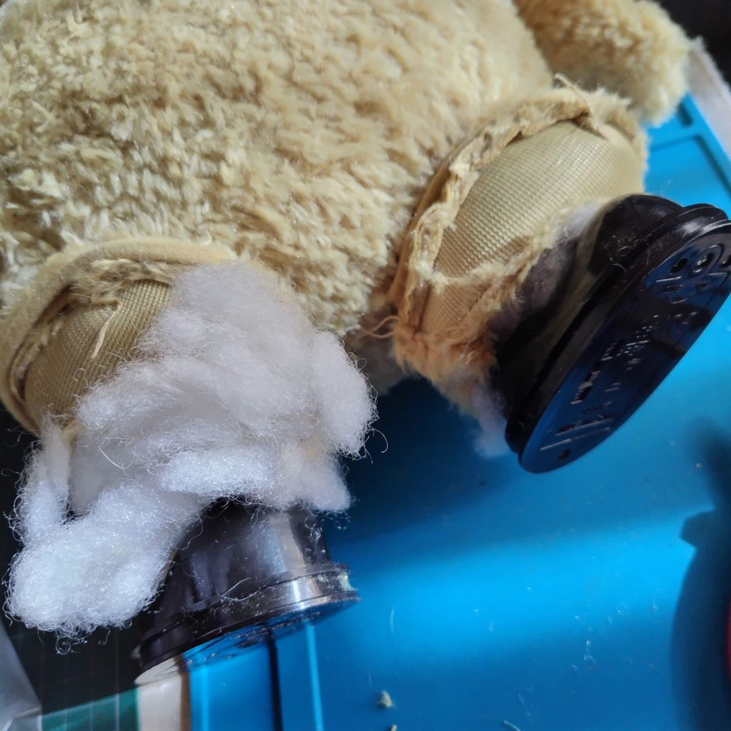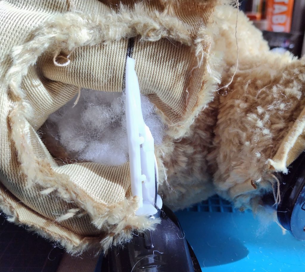 参考サイトでは背から中を開いていましたが、自分は足回りを外して股下を開いてスカートのようにしました。どちらが良かったのかわかりません。自分なりに考えたことは脚の骨折を修復したときに背中から入れることができるかどうか不安だったことにあります。ただ開いてみてわかったのはメイン回路の入っている部品は頭とはくっついていないので、脚を入れてから最後にメイン回路ボックスを入れる方法も取れたかもしれません。どちらにしても綿を上手に詰め込んで縫製する必要がありますが、背開きのほうが全体のバランスを見ながら綿詰めができるので良かったかもしれません。