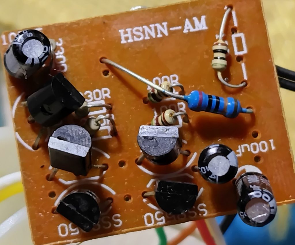 基板のパーツ側とハンダ側です。パーツのハンダ付けは部品が真っ直ぐにつけられずひどいですね。能動部品はSS8550が2つ、SS8050が3つでした。ハンダ面は比較的きれいですが芋ハンダも見られます。
