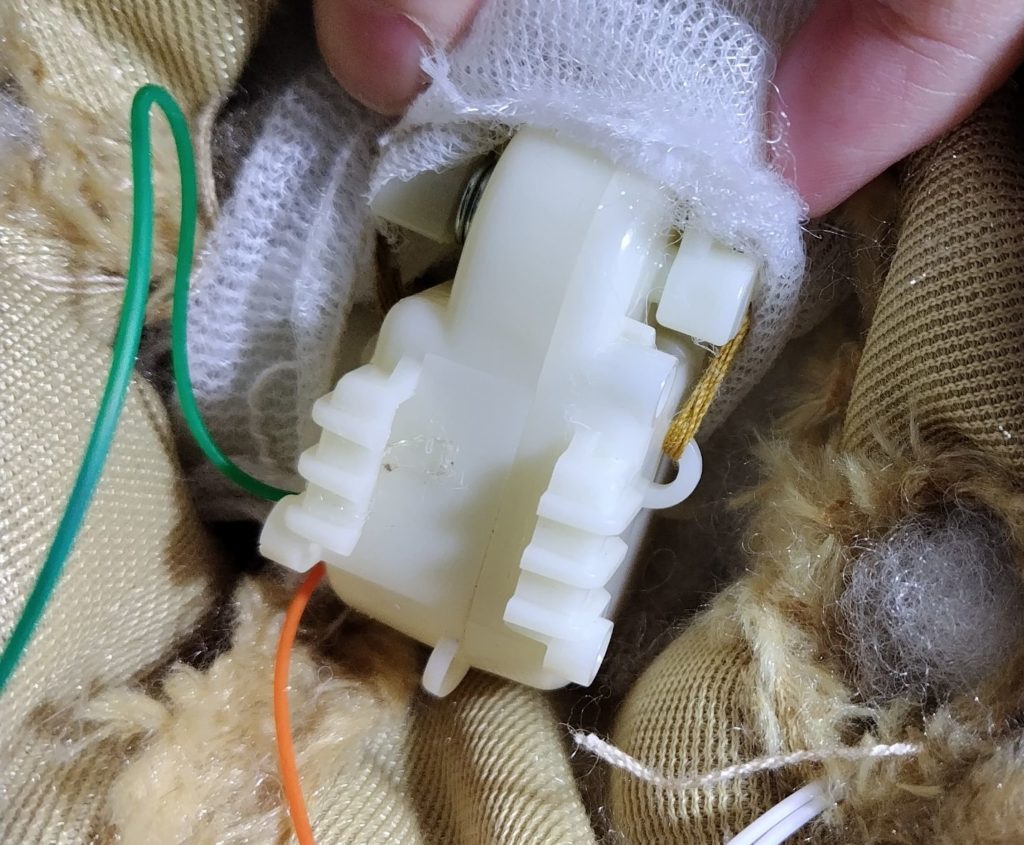 この結わえられた部分を切って部品を取り出すかどうか迷ったのですが、なんとか外皮をめくって中身を取り出せました。右下の白い部分は左腕に繋がる箇所です。スイッチの導線2本が接続しています。左側の緑と橙の導線は顎を動かす部品の中にあるモータに接続されています。