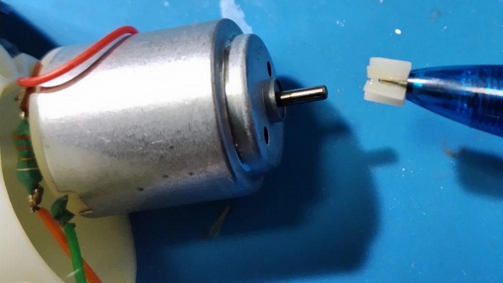 外してモータを取り出してスイッチをONするとモータが元気よく回ります。ピニオンギアをつまんで負荷をかけてもよく回り、そのうちギアがスッポ抜けてしまいました。どうやらギアが割れてモータの回転が顎の動きに連携していなかったようですね。ボールペンの先をギア穴に入れてみたら割れているのがはっきりとわかりました。