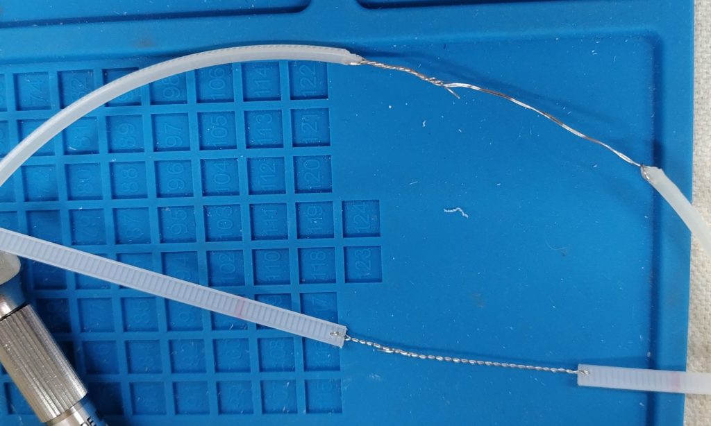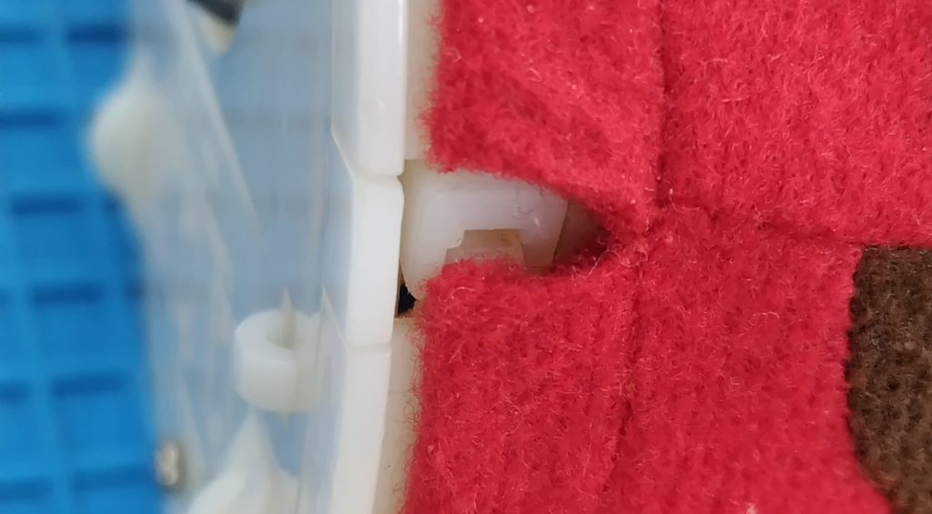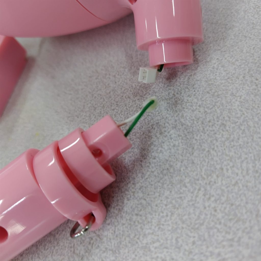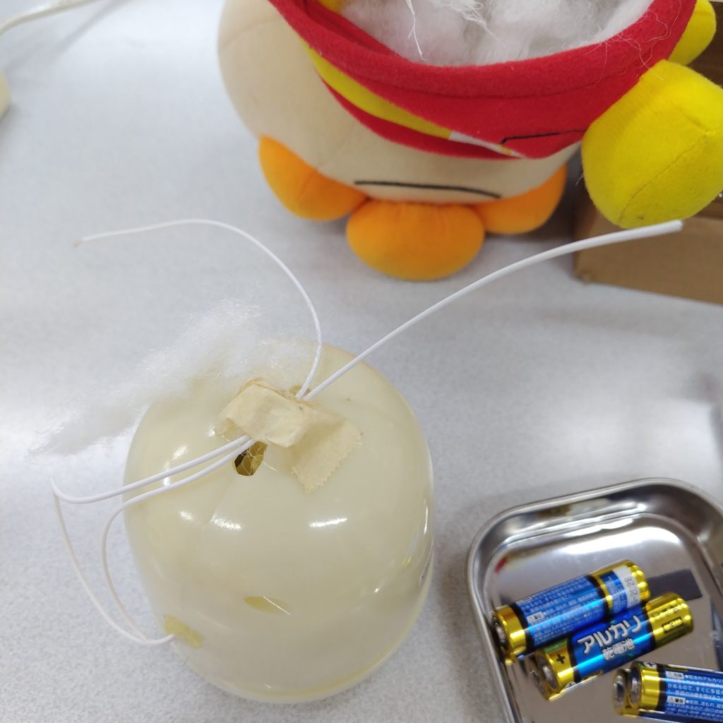 最後に駆動部をぬいぐるみの中にはめ込んで、裾を結束バンドで締めようとしたときに問題が生じました。周囲のドクターを含め30センチの結束バンドが最長だったのですが締め上げるには数センチの不足が出ます。これは古いバンドと交換しようと取り出したときに何かが引っかかるので取り出しにくかったので、反対側から引き出してワイヤで繋がれていることに気づきました。既にどなたかが先に修理をされていたようです(写真上のワイヤ)。自分でも真似をして写真下のように接続したうえで、熱収縮チューブで閉じることでワイヤが緩んで針が出ないように工夫しました。