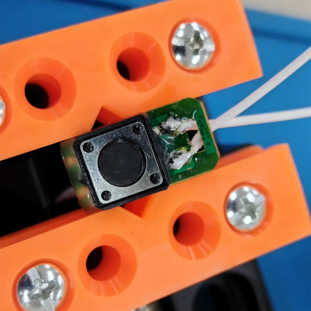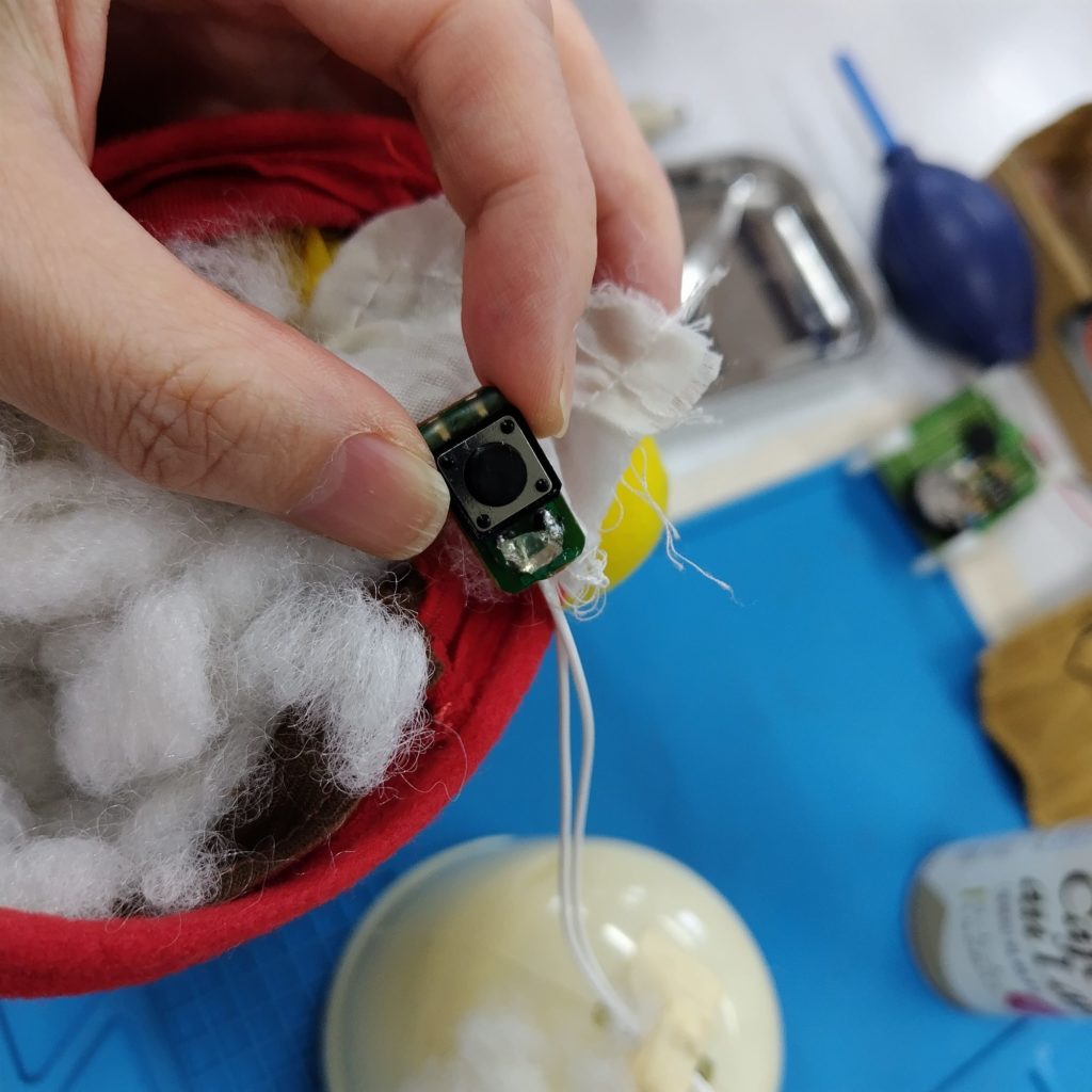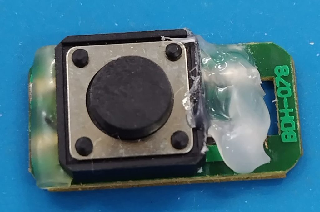 左手からタクトスイッチが出てきました。線が繋がっていません。タクトスイッチは基板に載せてあるだけで他のパーツはありません。スイッチの足に線を接続しつつ、基板の裏側から配線を取り出して固定できるようにしてあるはずですが、固定するホットボンドが表面しかついておらず裏面はなにもありませんでした。