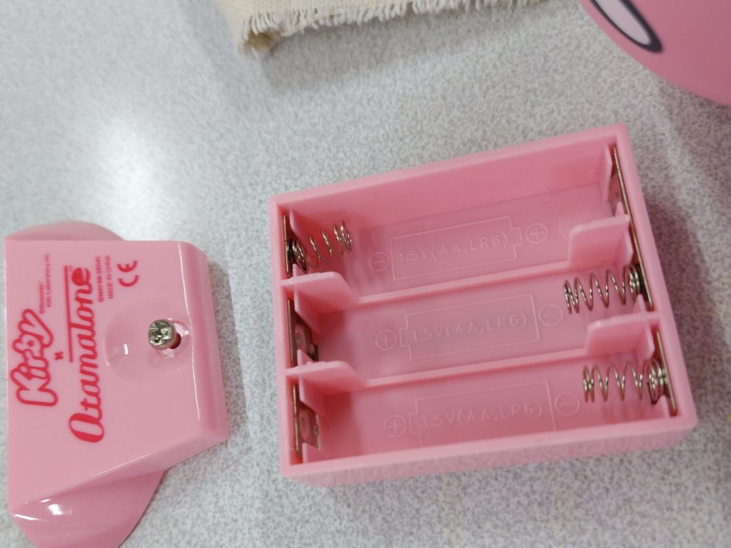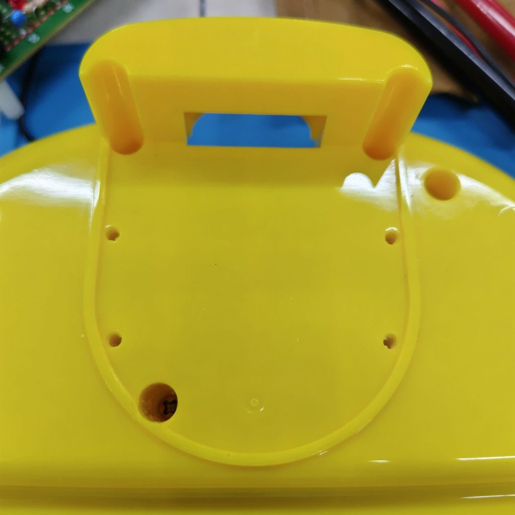 主訴は「動かない」。左手星の部分にスイッチがありここを押すとアンパンマンがくるくる回って喋りだすはずです。バッテリは新品で電池ボックスもきれいだったので、中の回路が断線している可能性を疑いました。足元にネジなどはなく裾から結束バンドの端が見えたので、ここから外せば良いことがわかりました。