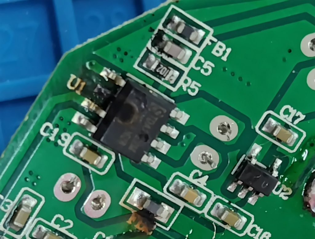 さて、どのように調べていこうかと一呼吸おいていたところ、ベテランドクターも初めてのおもちゃだったらしく、ちょっと見せてくれと言いながら基板を眺めていたら程なく「ICが焼けてるなぁ」と一言。単なるフラックスの汚れかと見過ごしていたのですが、IC本体のモールドに丸い焼け跡がついています。