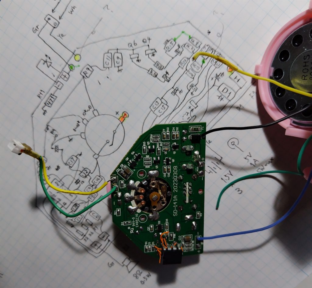 回路はちょっと汚れていますが、支柱に繋がる部分にヘッドフォンジャックが使われていることは初めて知りました。電源はスイッチ付き可変抵抗を経て回路に供給されていて、出力はスピーカとメリーの回転に通電するヘッドフォンジャックです。スピーカはチェッカの音がきれいに出たので問題無し。