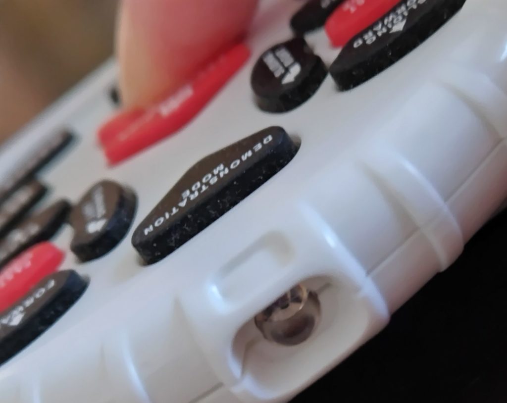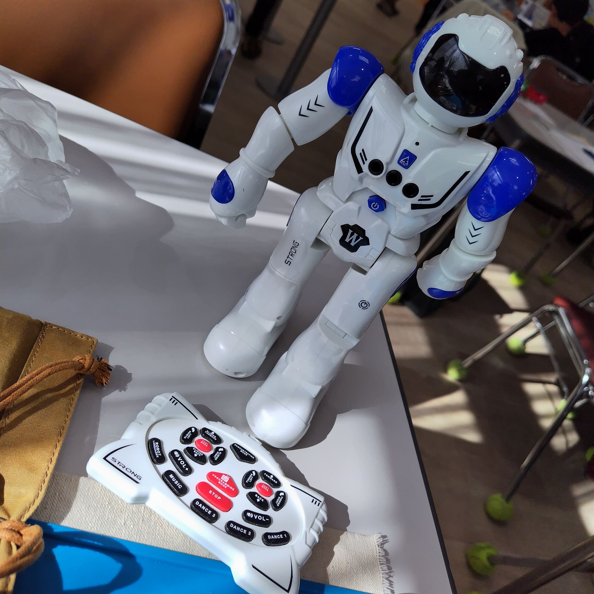 コントローラは電圧が正常で、スマホのカメラで見ると赤外線信号も出ているようです。個々の動作はマニュアルがないのでテストできませんが、ストップボタンを押したらロボットの動きが止まりました。ボタンの数からするとかなりいろいろな操作ができそうなロボットです。