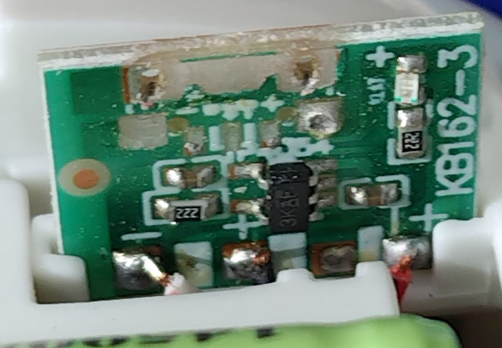 黒い部品に3KAFのマークはリチウムイオン電池の充電保護回路のようです。つまりこの基板(KB162-3)はマイクロUSBから受けた5Vの電源を保護回路を通して電池に充電するためのものです。