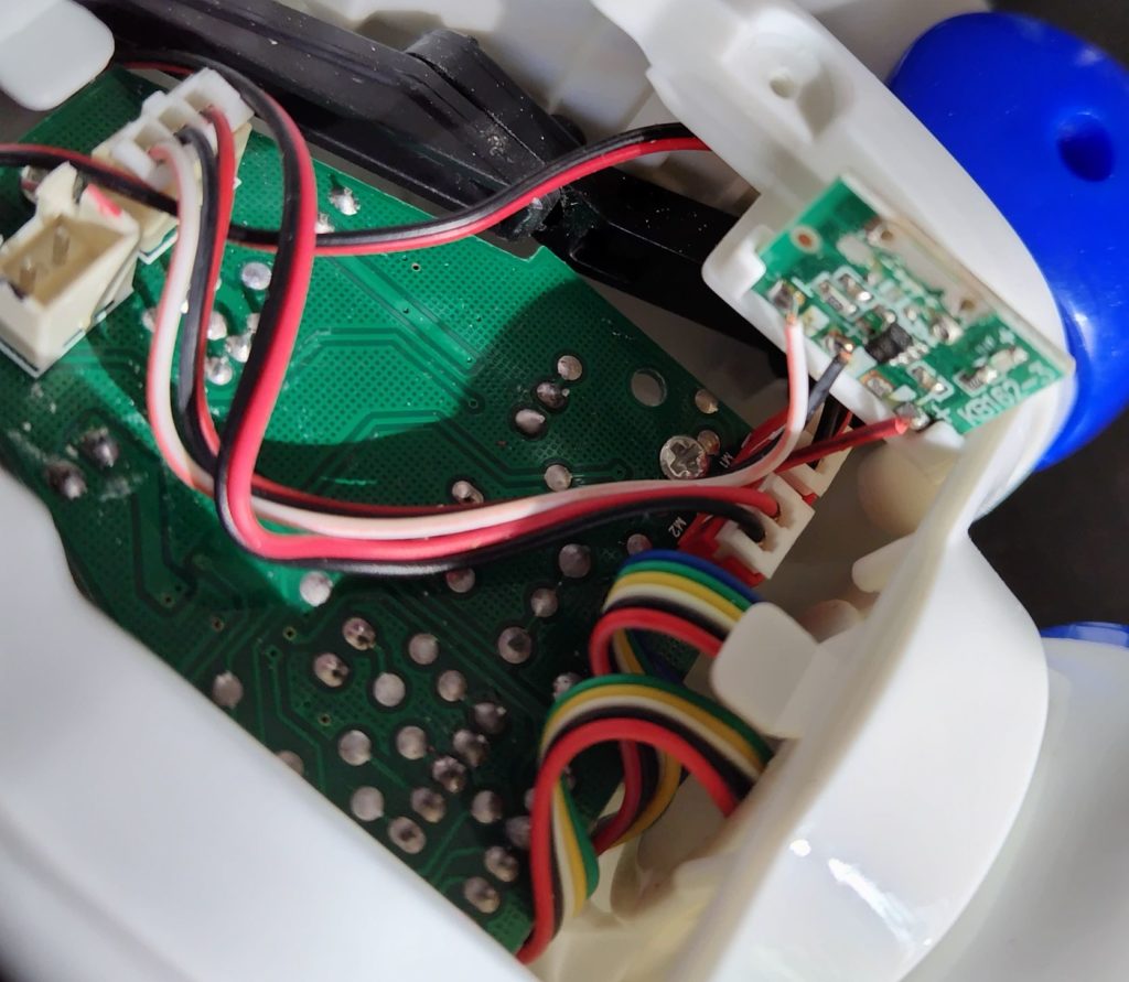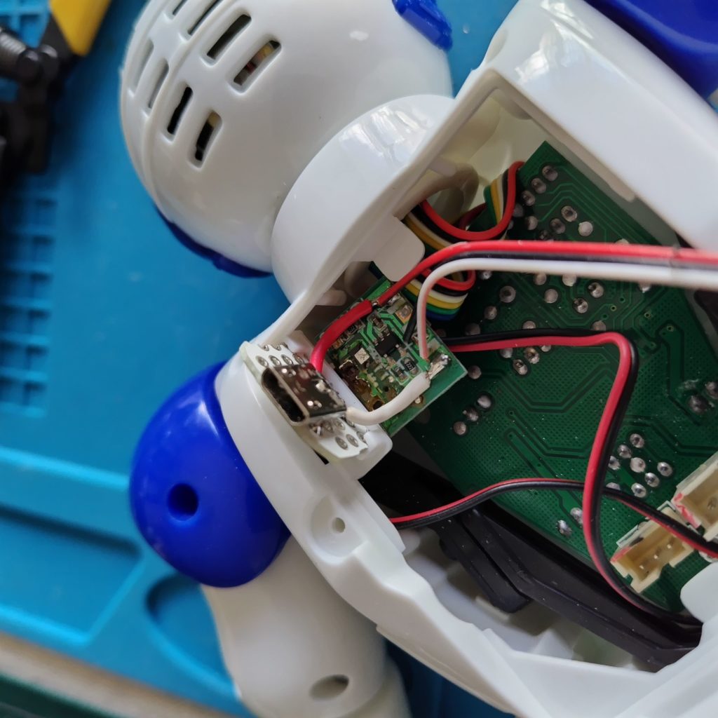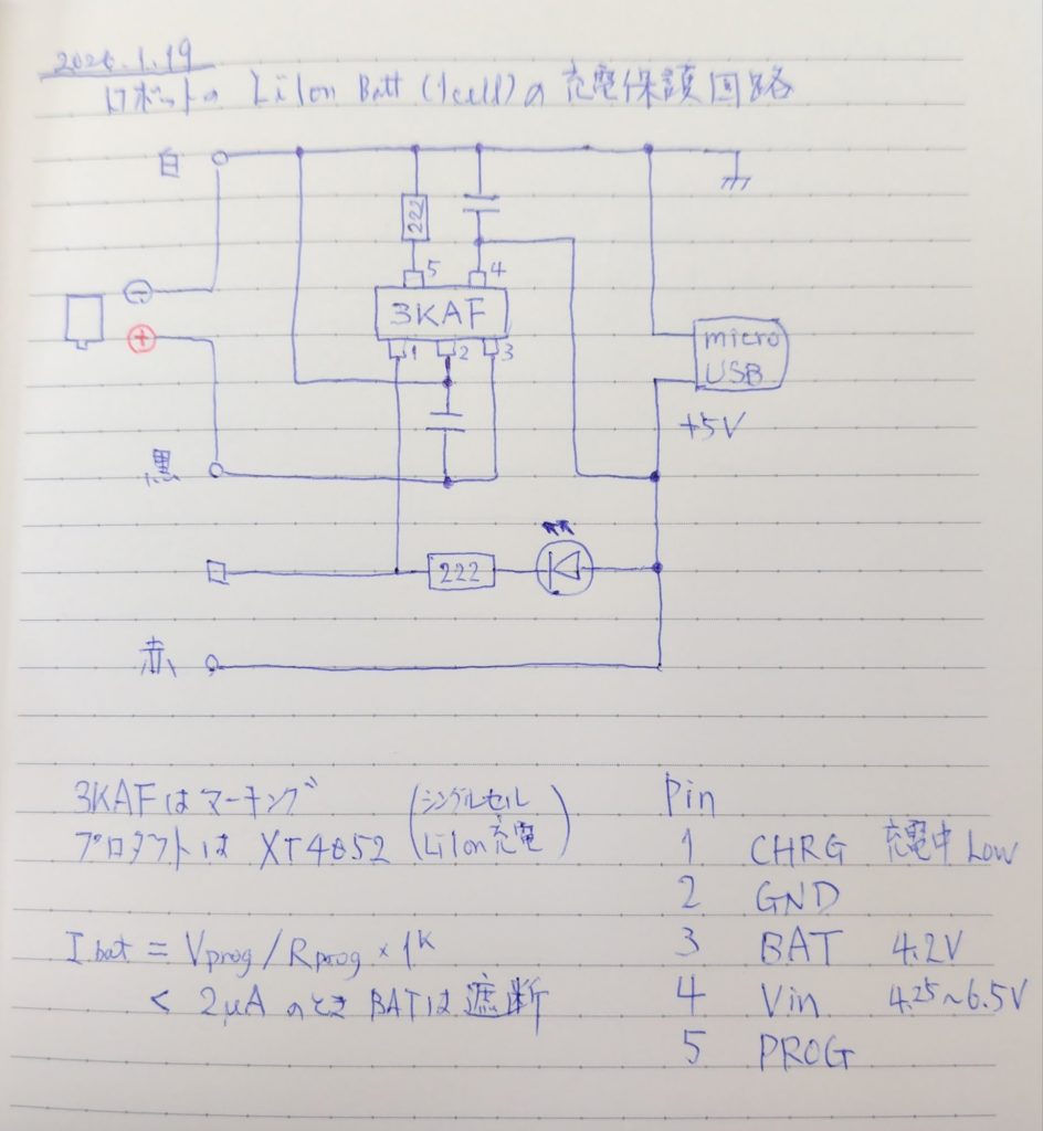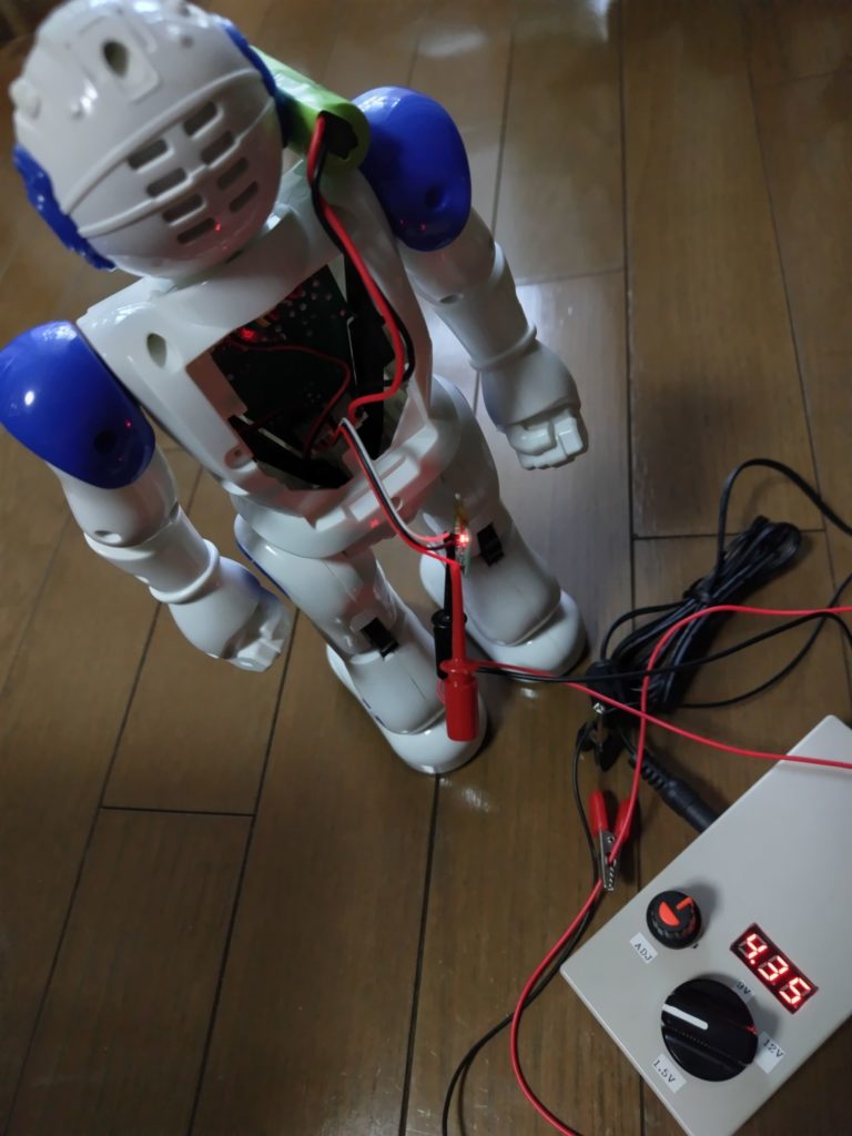 以上の仮説に基づいて、修理した後で話が違ったということにならないように、充電回路と電池を本体に戻し、充電回路に電源から電圧をかけて実際に充電できるかテストしました。1時間ほど充電しましたが、LEDは点灯したままでしたが、一旦ここで充電をやめて電源を外してスイッチを入れたら、ロボットが動き出しました!(1月21日現在)