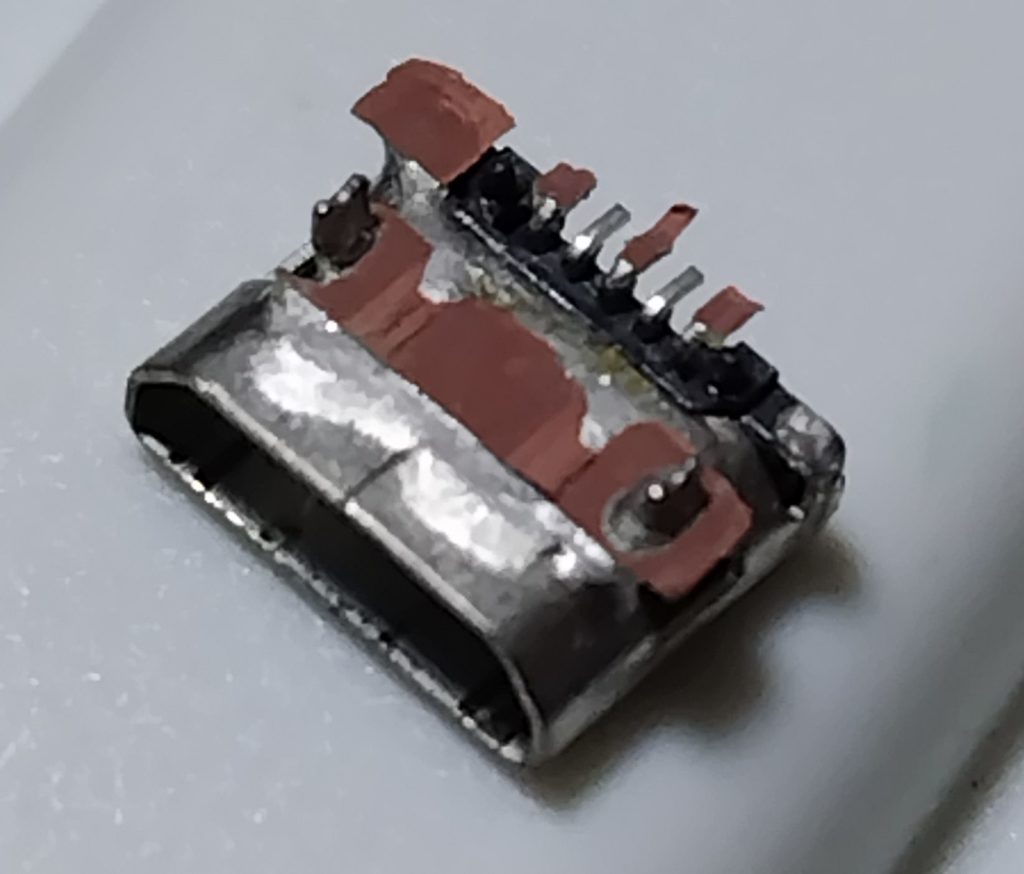 マイクロUSBの端子は基板の穴にはめ込んで位置決めさせるようになっています。しかしこれだけでは、水平方向へのズレには強いかもしれませんが、脚が基板に噛んでいるわけではないので、剥がすような垂直の力が加わると基板の表面ごと簡単に外れてしまいます。本来であれば端子が動かないように躯体側で勘合させて固定すべきですがそこは設計上考慮されていません。USBケーブル側のプラグ端子の曲がり具合からしてもなにかの力が加わって一瞬にして剥がれてしまったと考えられます。