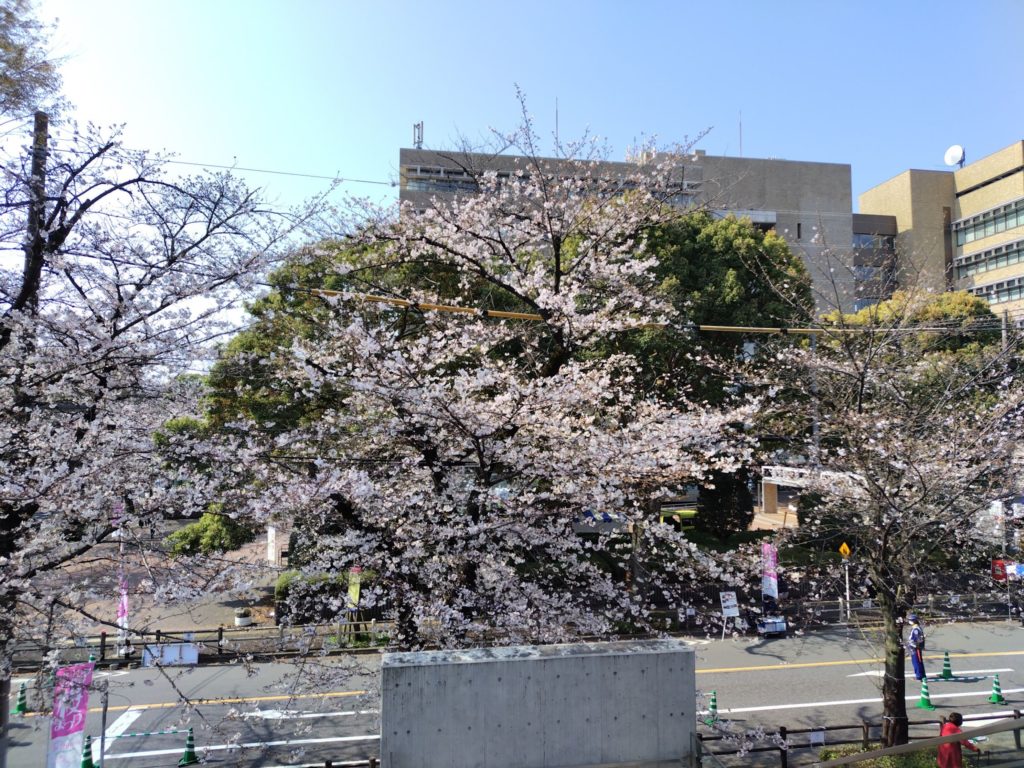会場の眼の前の武蔵野市役所周辺の桜の木は満開。都内でも屈指の桜の名所です。