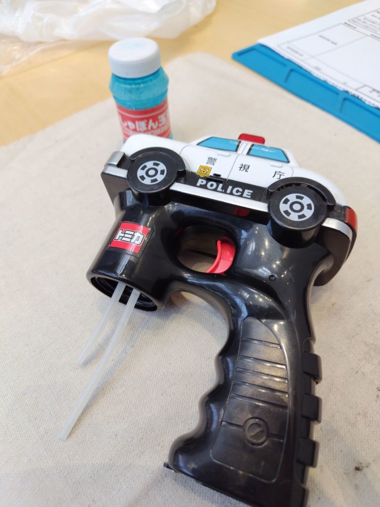 引き金を引くと赤色灯と正面のライトが点灯してシャボン玉が出るというおもちゃです。存在は前から知っていましたが実物を触るのは初めて。
