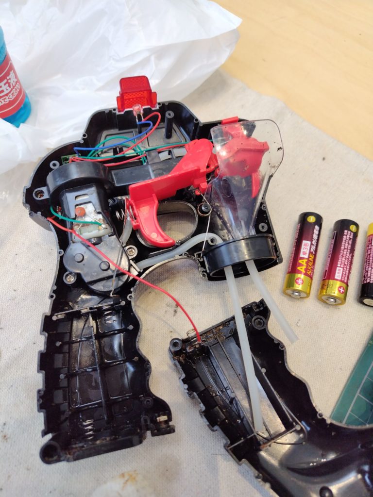 シャボン液のポンプアップもうまく行っているようですが、引き金を引くと吹き出し口のところのレバーが動いてシャボンの膜を作る機能がうまく動きません。沢山遊んだのか内部は砂だらけになっていて引き金もがたがたしています。砂をきれいに取り除いても動きが固くて手詰まりです。