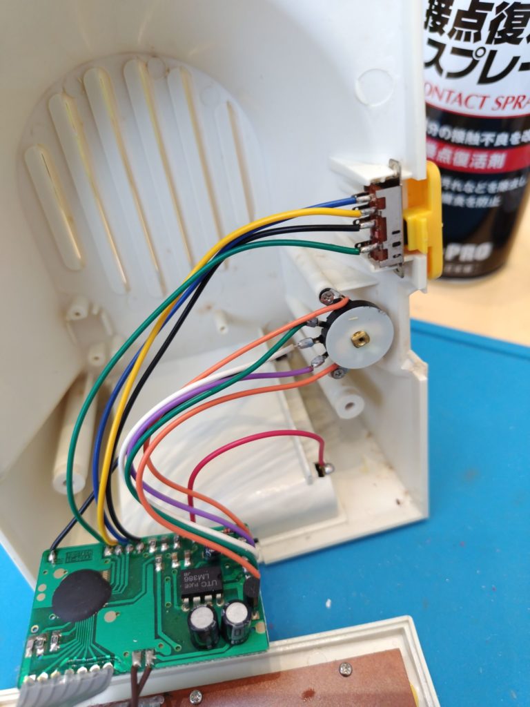 アルコールで拭き取って洗浄、スライドスイッチには接点復活剤、スピーカの導線が切れかかっていたのでハンダ付け、これで本来の動きを取り戻したようです。