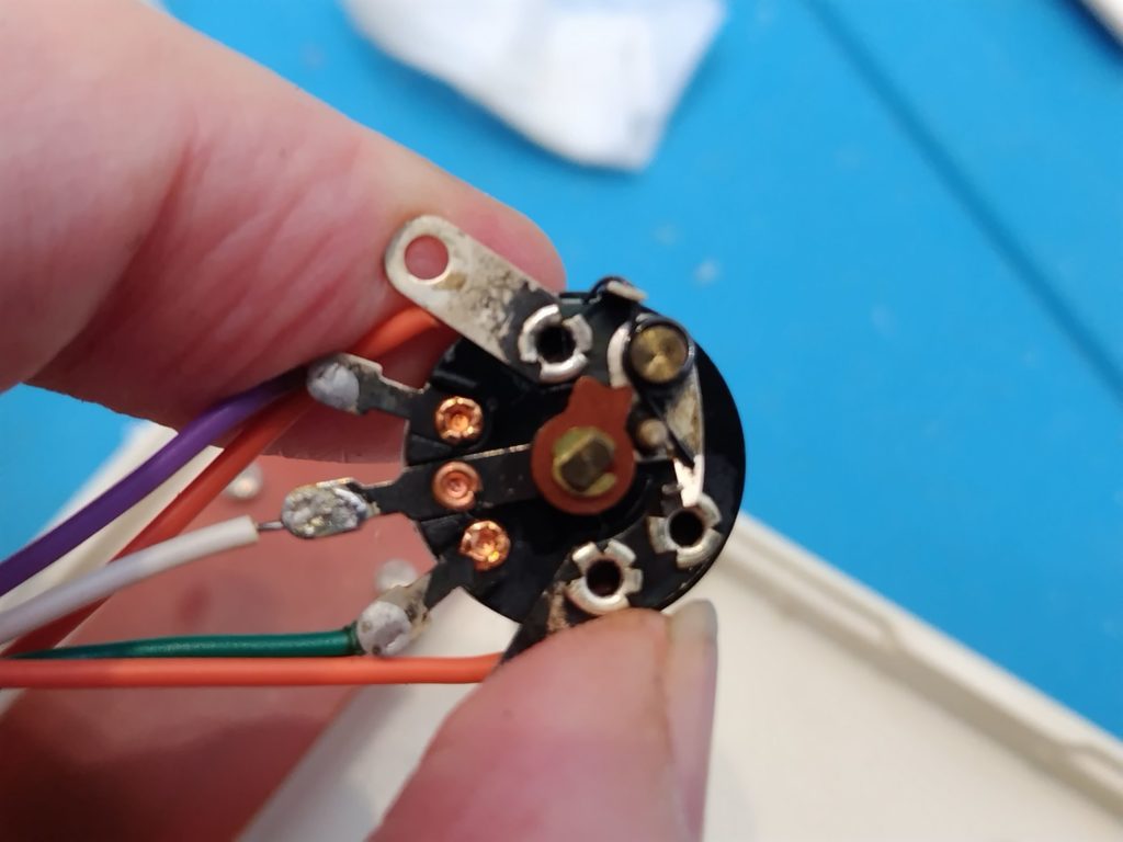結果的にはボリューム内部はきれいでしたが、ボリュームのスイッチ部分の接触が黒ずんで不良になっていました。長いこと使ったようで、黒い粉と埃や油脂がついていたので絶縁されてしまったのかも知れません。幸いにもボリュームのガリはありません。