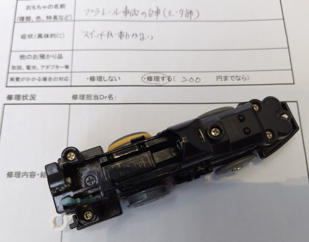 たしかにビクともしません。本体の部分がないままで持ち込まれたのは初めてです。早速、スイッチ部分を見ることにしました。順番に分解してギアをバラバラにしないようにそっと開きました。昨日の教訓が活きています。